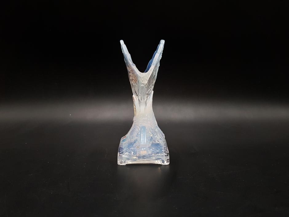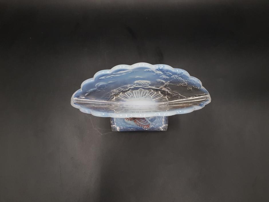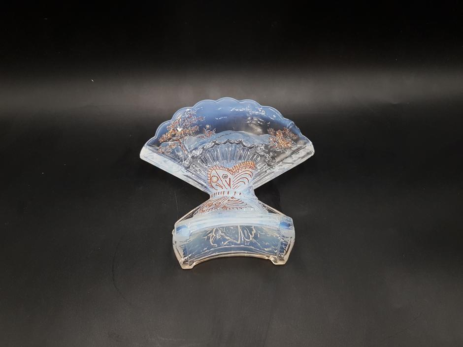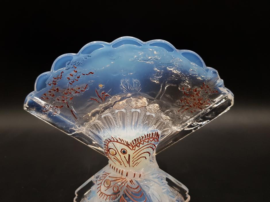 Baccarat – Gracioso vaso em forma de leque feito em cristal moldado opalescente, modelo Eventail, com um design japonista criado em 1878, decorado com uma paisagem e borboletas, árvores e flores na haste. Enriquecido com esmalte vermelho, azul e dourado e finalizado com base retangular. Cristal roxo nas bordas.