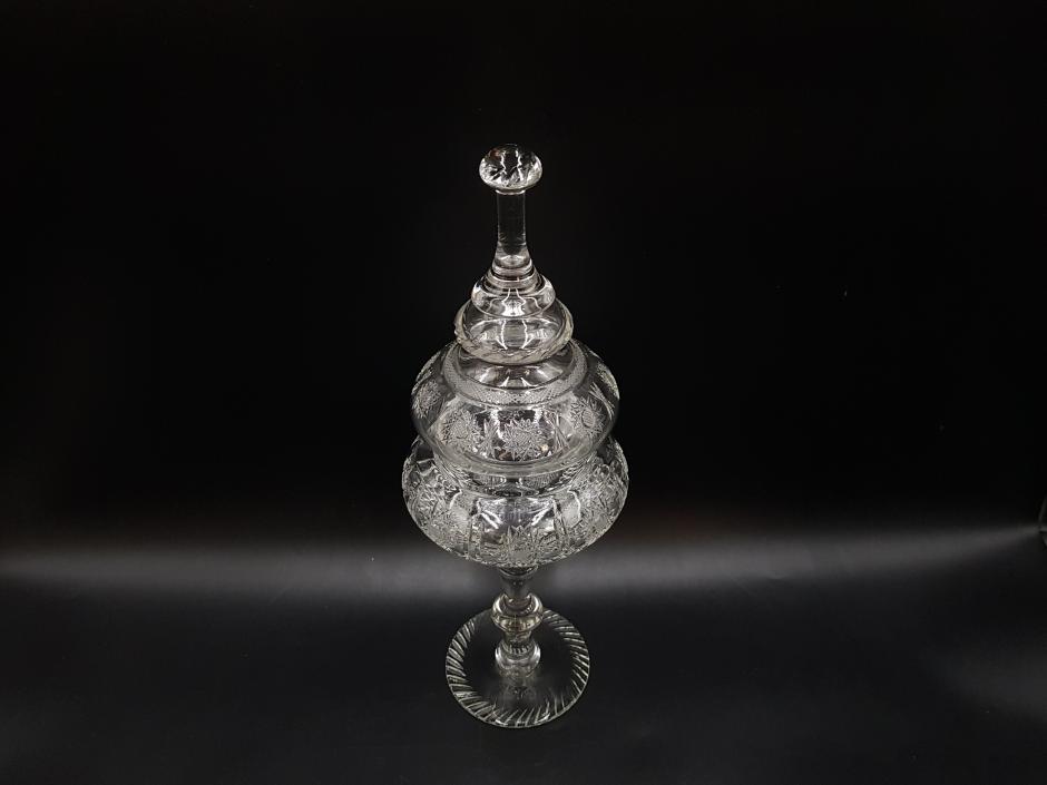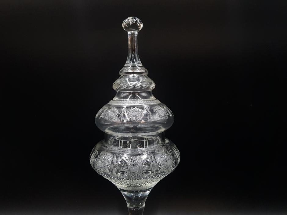 Majestosa compoteira com pé alto em cristal translúcido, bojo e tampa ricamente decorados com lapidações de rosetas, frisos e bico de jaca, haste lisa com detalhes ondulados e base redonda. Tampa com pega pontiaguda com terminação esférica.
