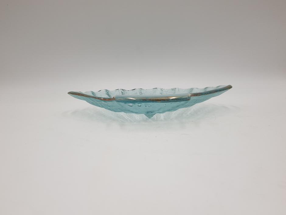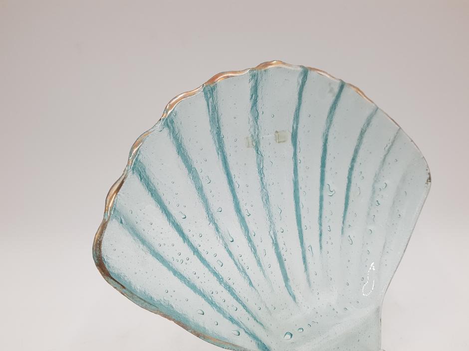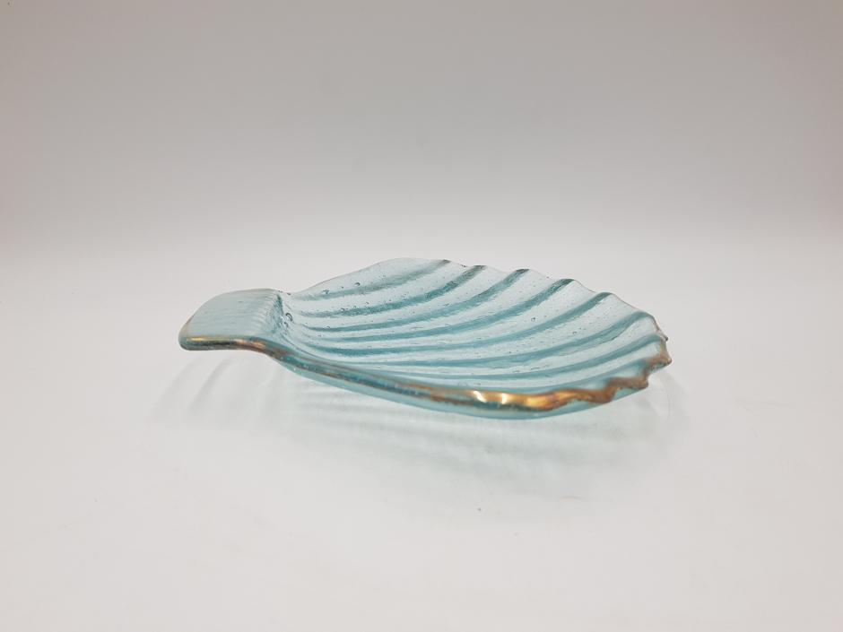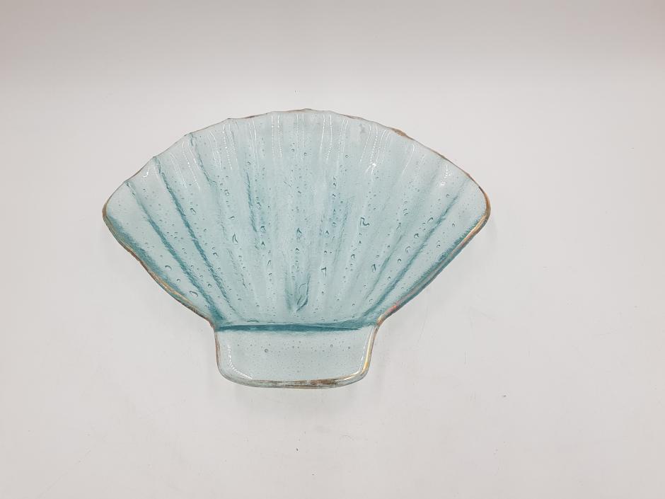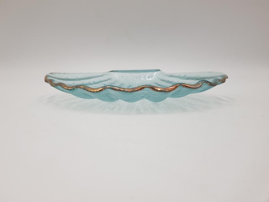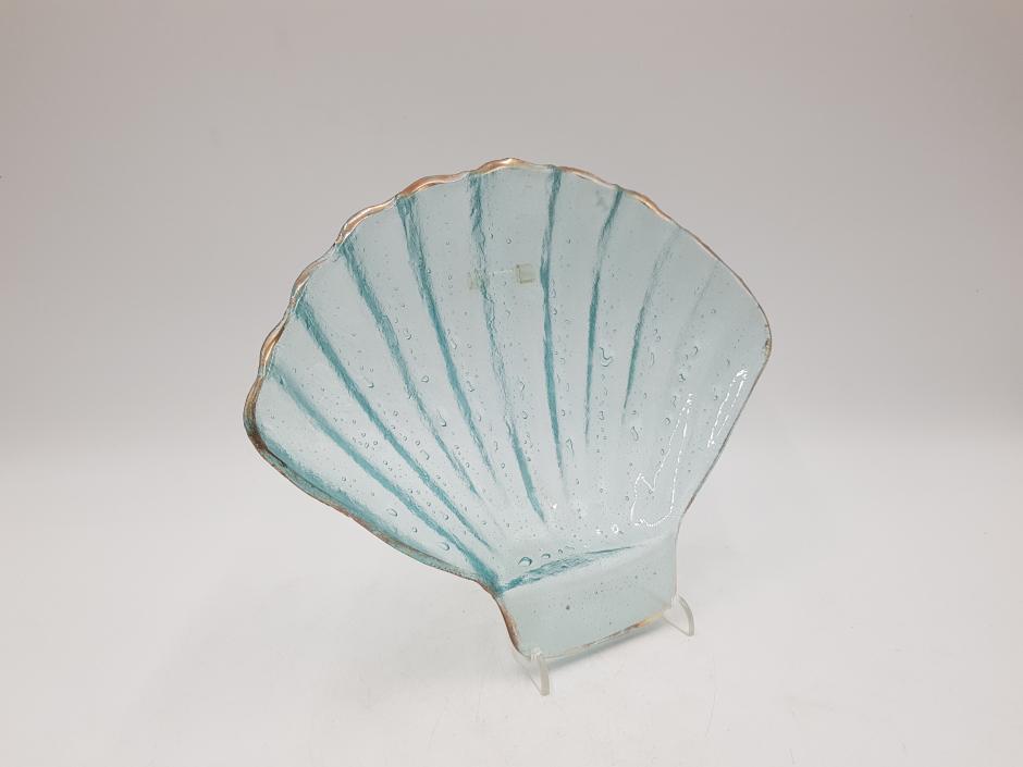 Belíssima petisqueira em vidro artístico na tonalidade vergue-água com formato de concha, decorada com gotículas internas e finalizada com borda dourada.
