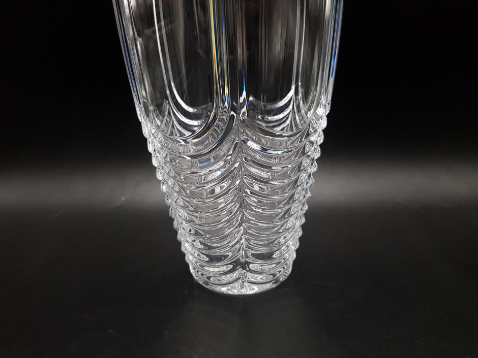 Majestoso vaso em cristal da Bohemia modelo Orion, translúcido, formato cônico ricamente decorado com lapidação escama e frisos, finalizado com borda ondulada.