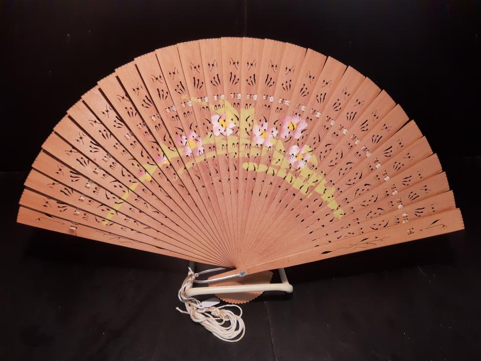 Pequeno leque em madeira, rendado e decorado com flores pintas à mão.