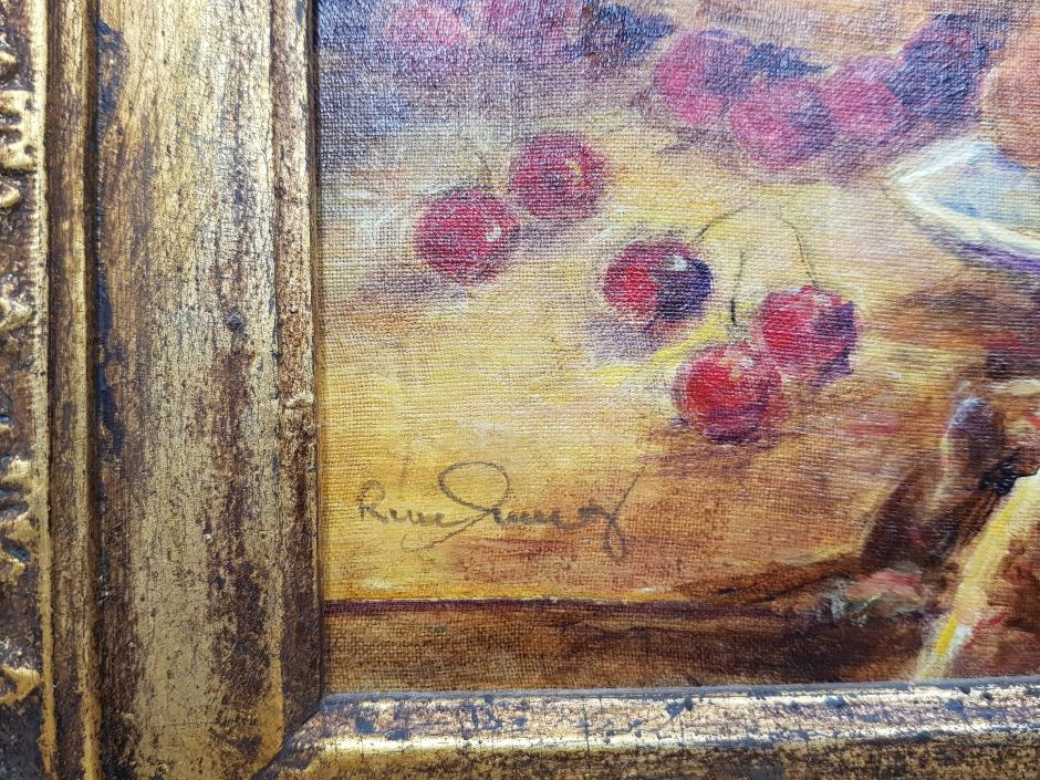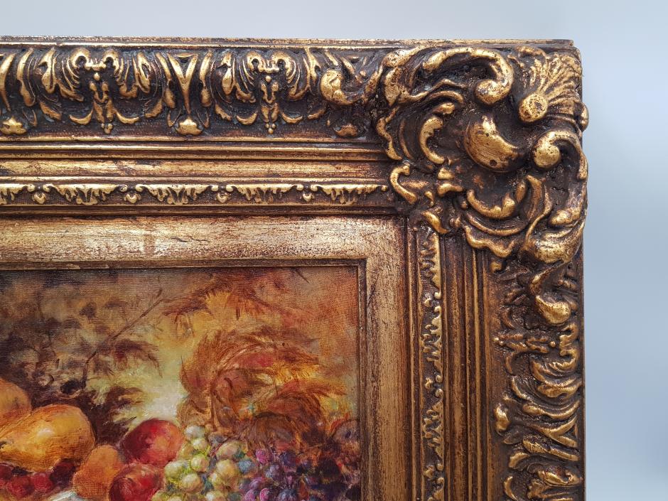 Belíssimo quadro natureza morta em óleo sobre eucatex, pintado pelo artista plástico brasileiro Ruse Muniz. Rica moldura na cor dourada com trabalhos florais em relevo. Assinatura no canto inferior esquerdo.