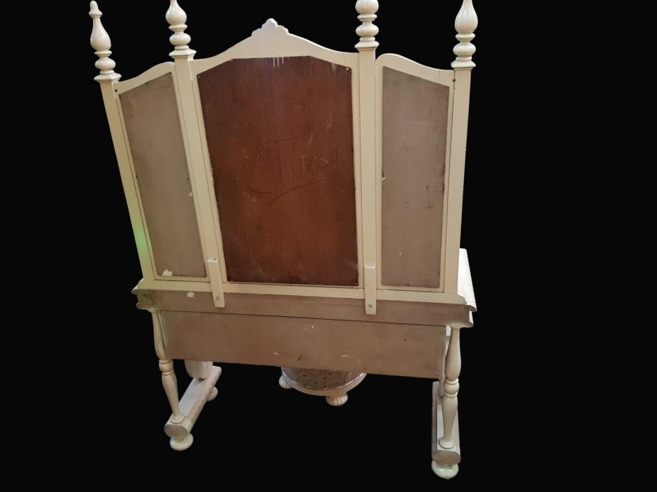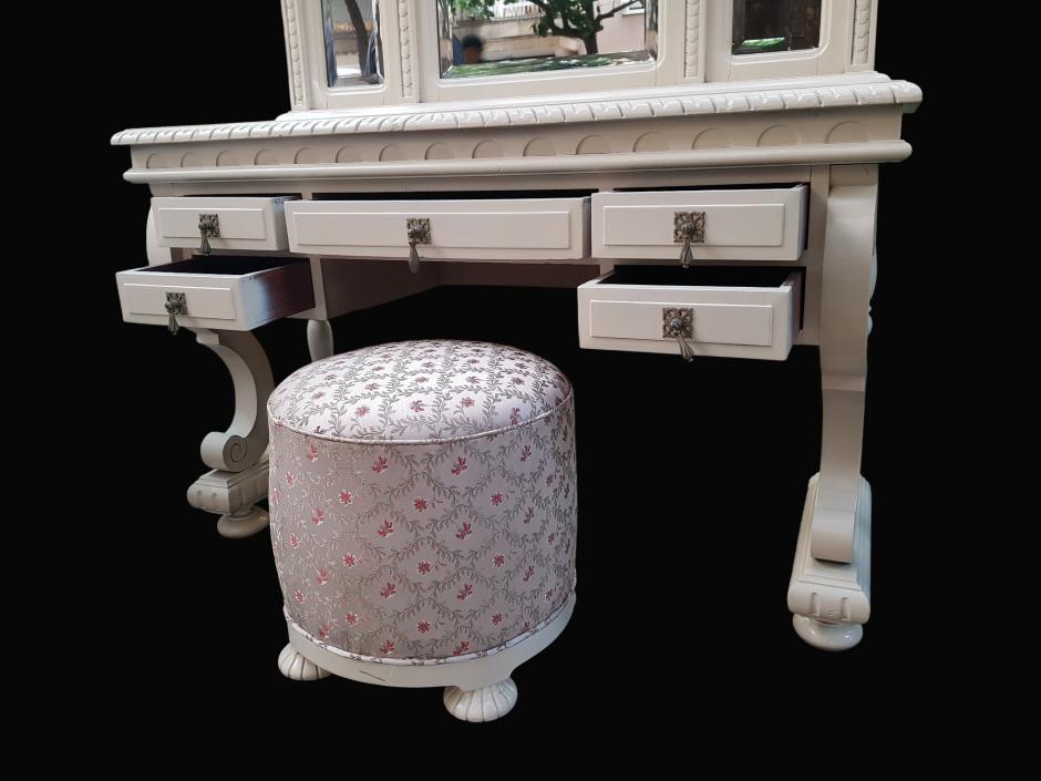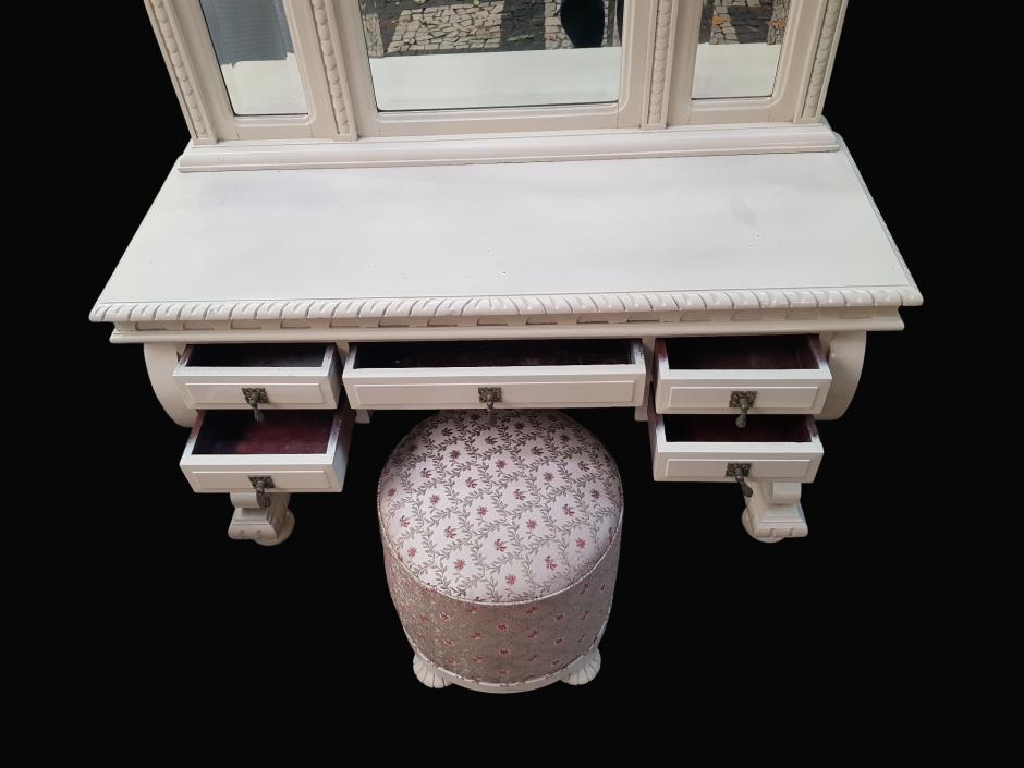 Belíssima penteadeira branca confeccionada em madeira nobre, ricamente decorada com trabalhos de entalhe, na parte superior conta com 03 espelhos bisotados encimados com detalhes no feitio de pinhas, na parte inferior possui 05 gavetas com puxadores em metal trabalhado, finalizada com 04 pernas recurvadas e apoiadas sobre base com pés bojudos. Acompanha uma banqueta com estofado floral.