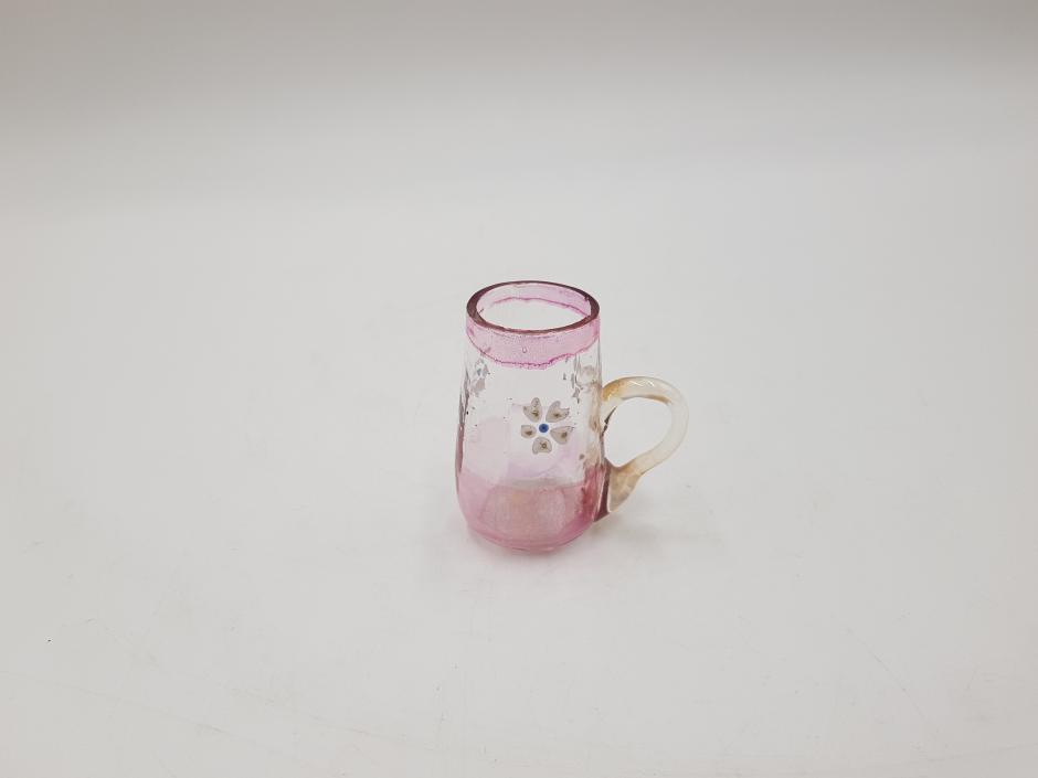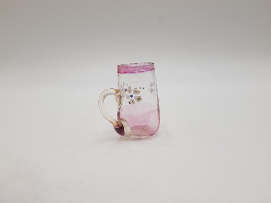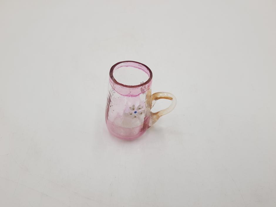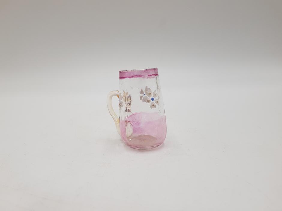 Miniatura de caneca em vidro com tonalidade rosa e translúcido, decorado com flores.