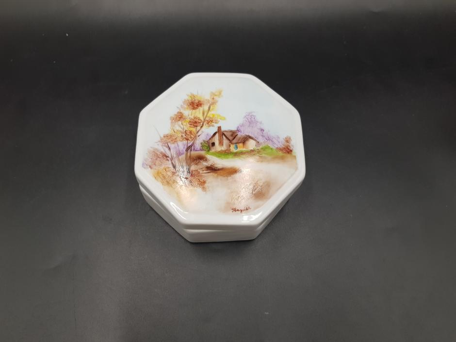 Caixa em porcelana com formato octogonal, tampa decorada com cena de paisagem pintada à mão. Diâmetro: 12cm