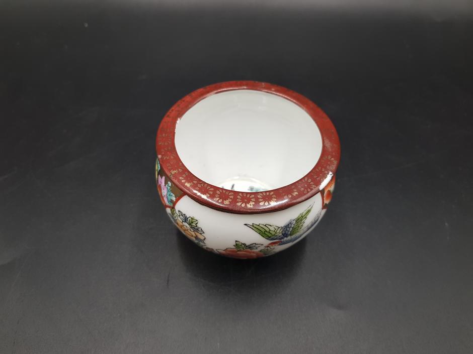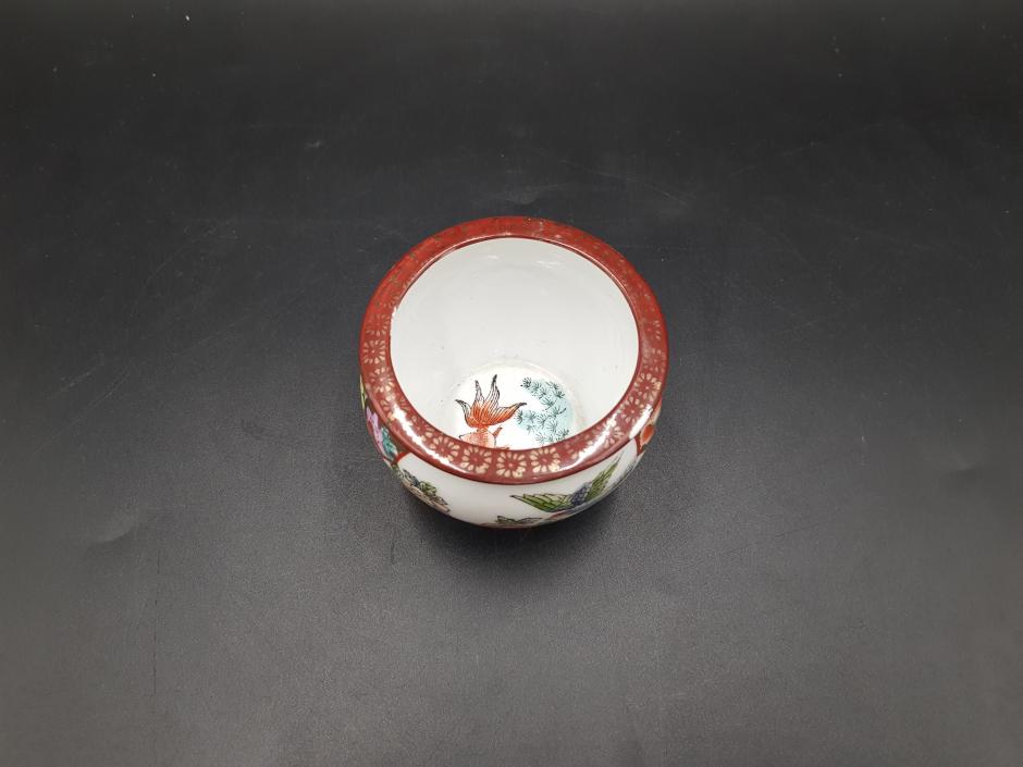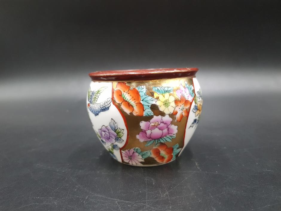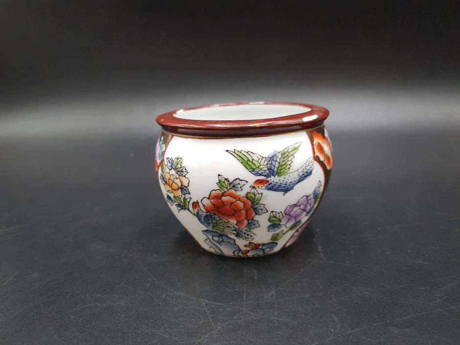 Mine vaso em porcelana branca com decoração de flores e pássaros.