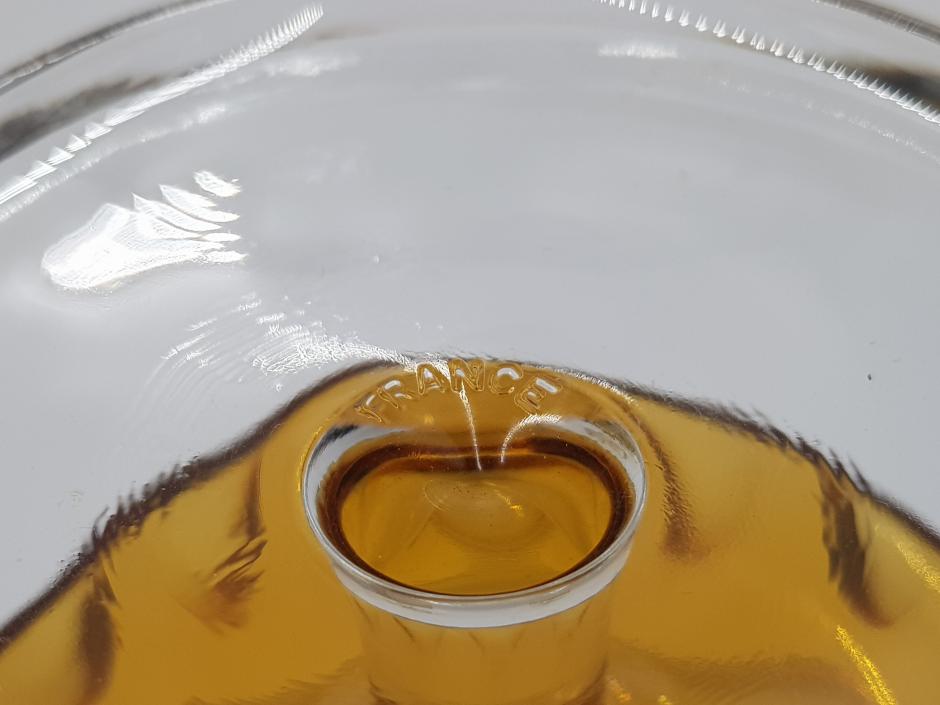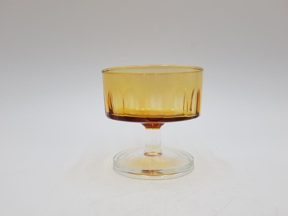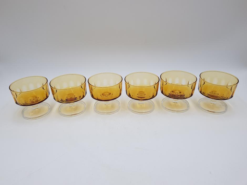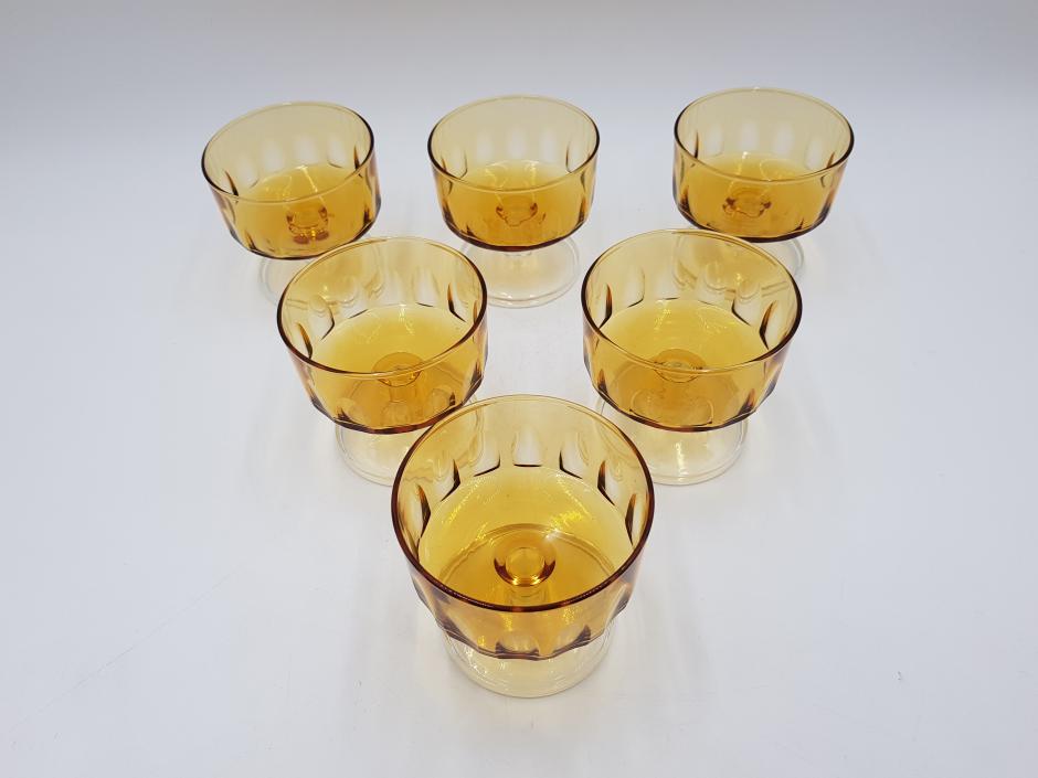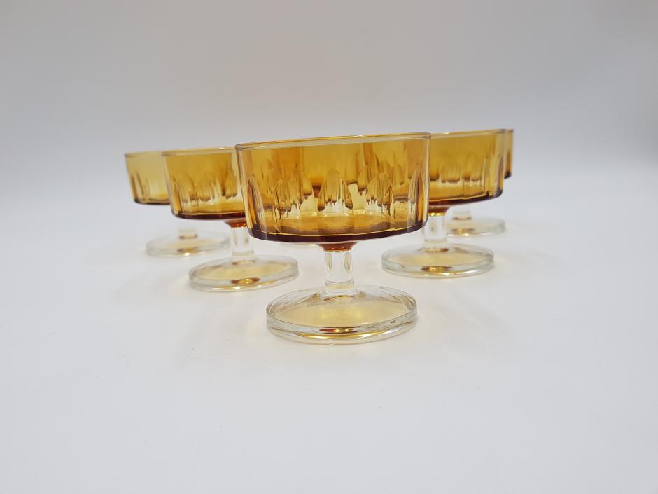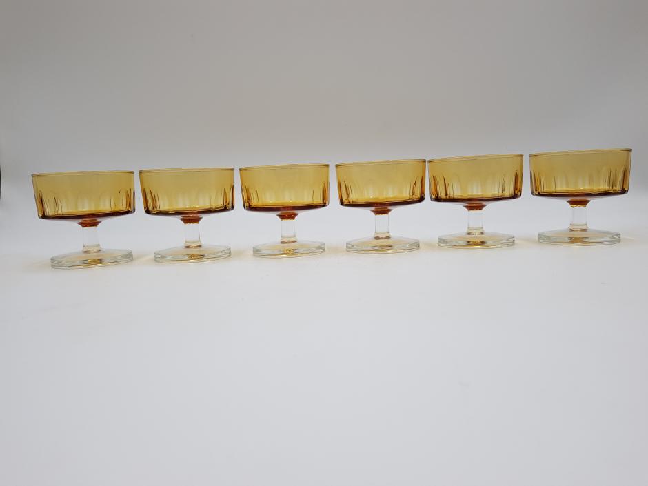 Lindo conjunto com 06 taças coupe em vidro francês, bojo facetado na cor âmbar, finalizada com haste e base translúcidos.