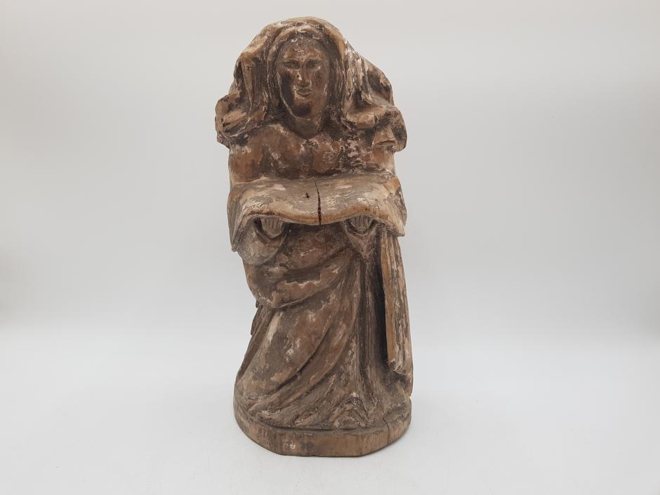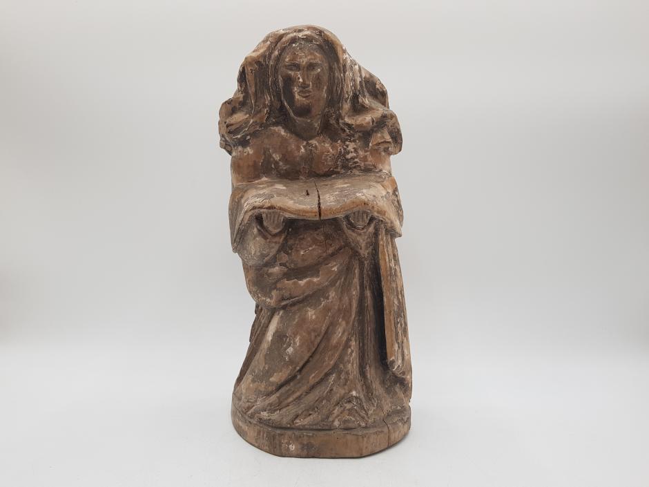 Arte Sacra – Antiga escultura em bloco de madeira entalhada representando nossa senhora, no estilo Barroco Colonial de fatura popular, com período estimado entre final do século XVlll e primeira metade do século XlX.