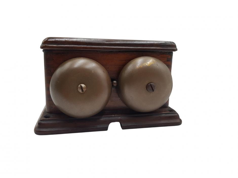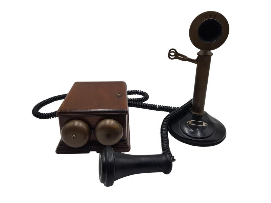 Antigo telefone de mesa a magneto tipo castiçal com a caixa de campainhas em madeira nobre, anos 50, de propriedade da Cia. Telephonica Rio.