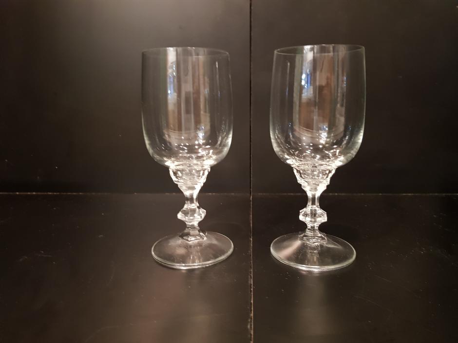 Par de taças para vinho tinto em vidro translúcido, haste facetada e base redonda.