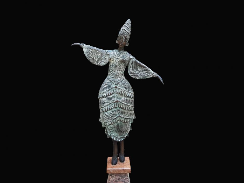 Imponente escultura em bronze no estilo Art Déco, inspirada no modelo original de Demetre Chiparus (1886–1947). A obra retrata uma dançarina em pose coreográfica com traje teatral exótico extremamente detalhado, caracterizado pelas camadas de "escamas" ou franjas na saia e o chapéu cônico (headdress) elaborado. Guarnecida sobre uma linda base de mármore em tons rosé.