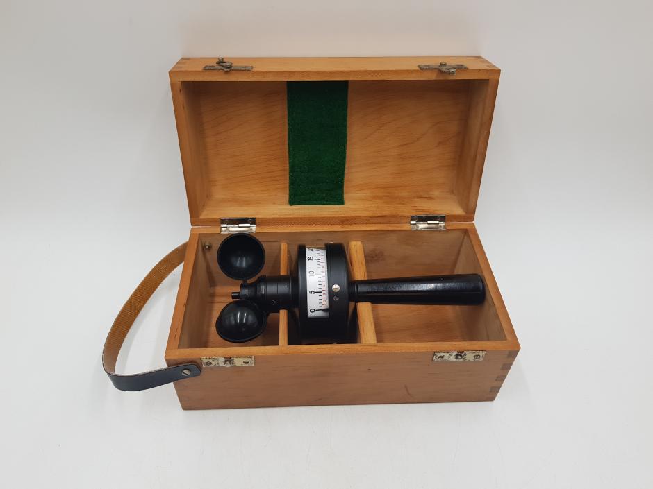 Anemômetro de mão modelo conchas, utilizado para medir a velocidade do vento. Conta com estojo em caixa de madeira. Altura: 20cm
