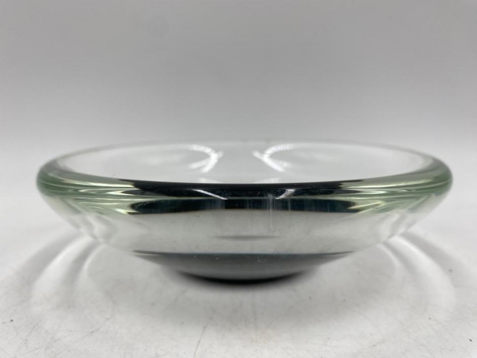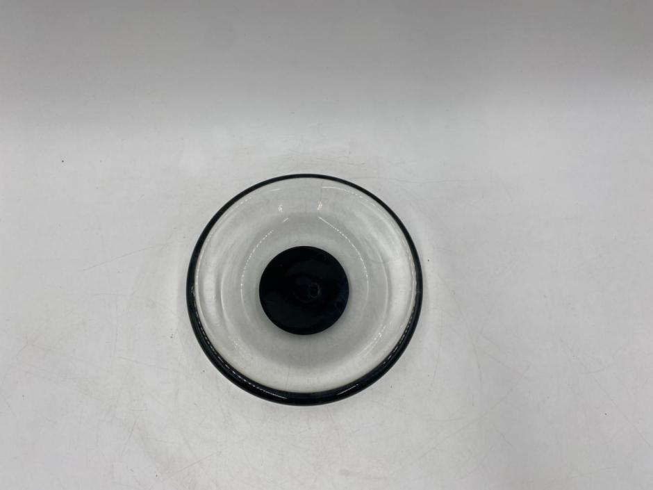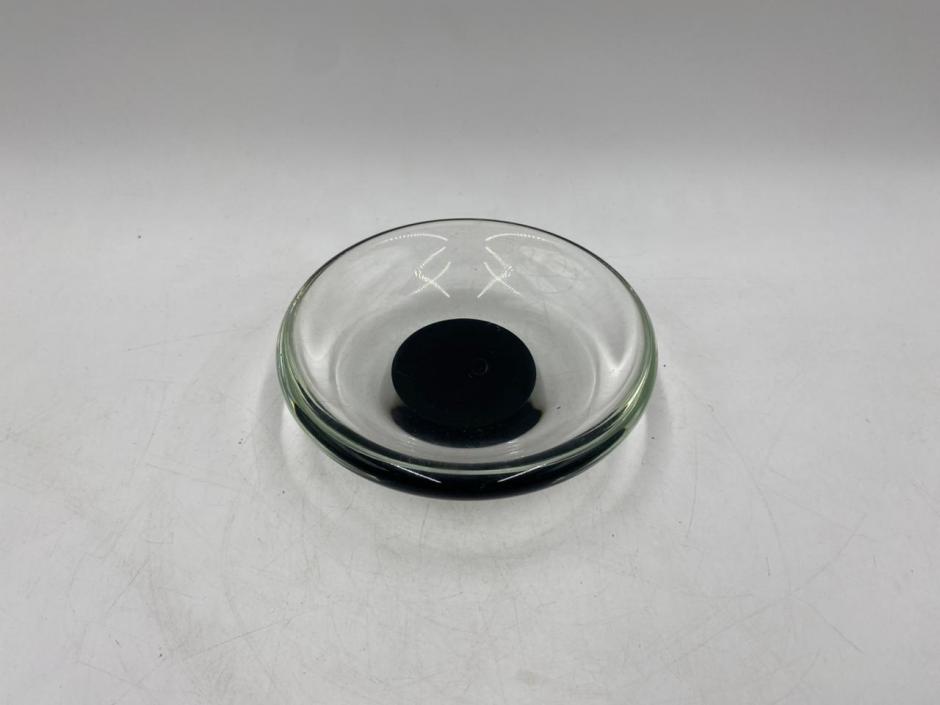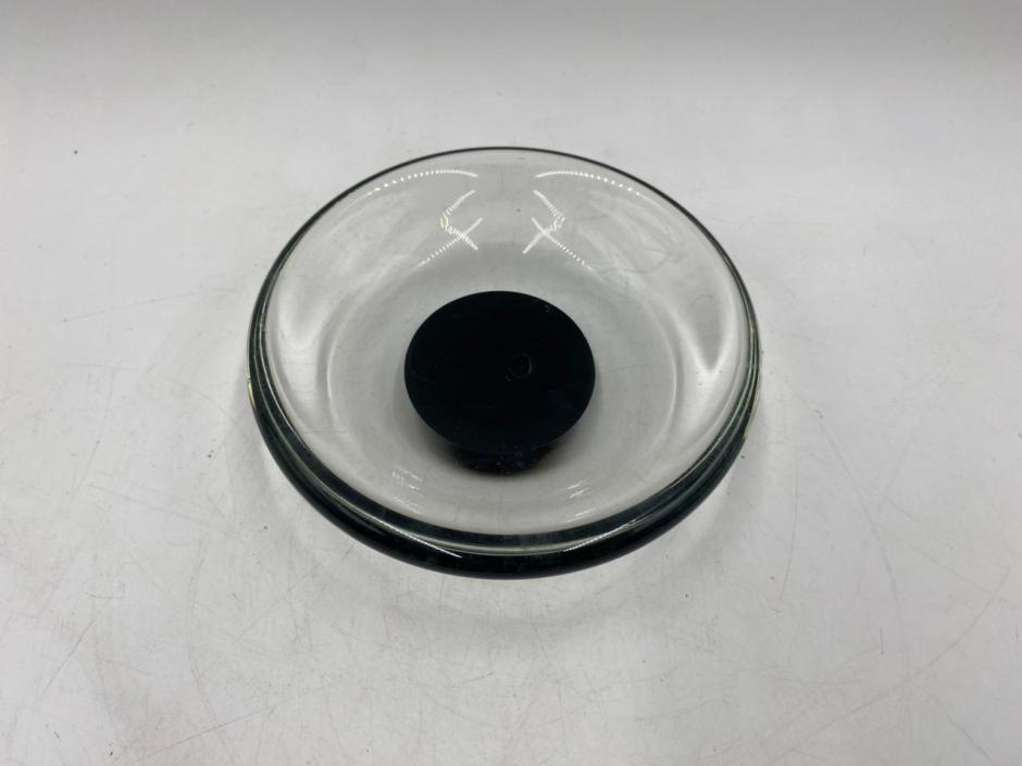 Belo cinzeiro em murano translúcido da marca Ca’d’Oro, formato redondo finalizado com base na cor preta. Diâmetro: 22cm