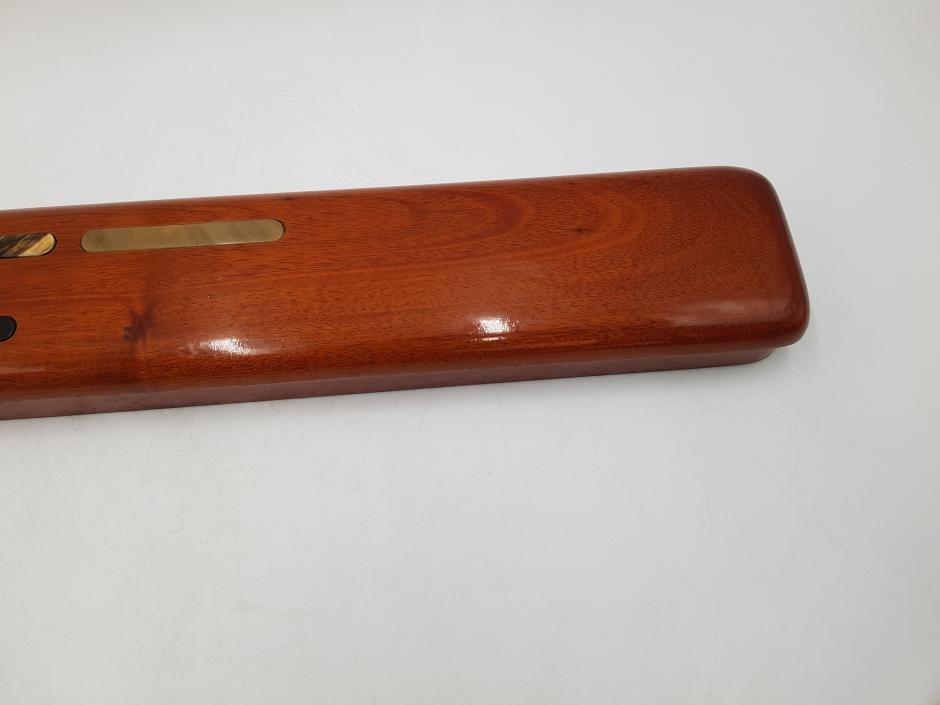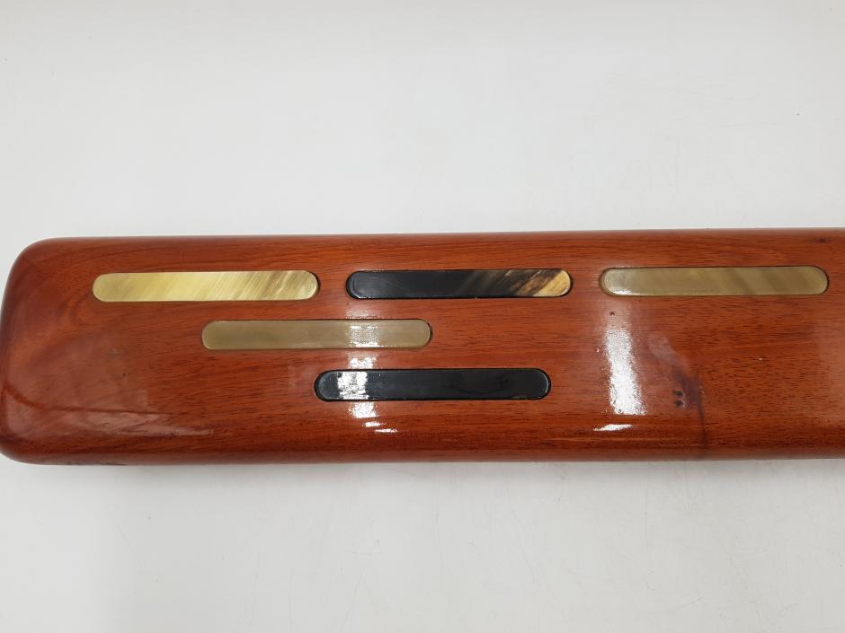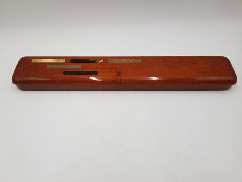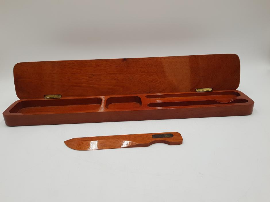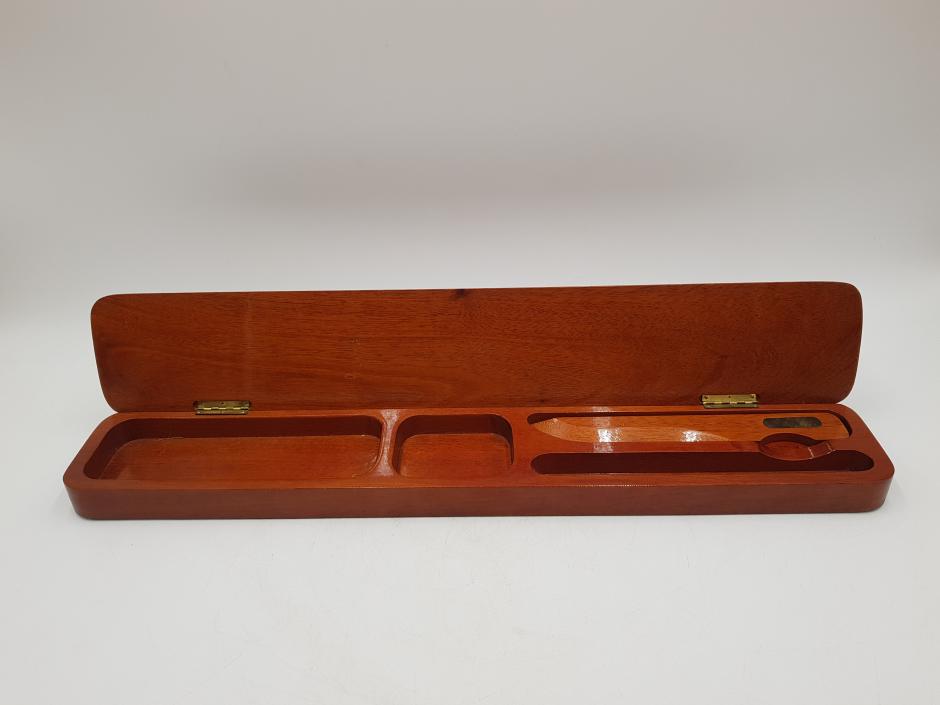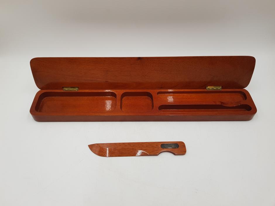 Estojo/Case em madeira nobre de forma elegante, com formato retangular utilizado para armazenar canetas, lápis e clipes, possui um abridor de carta também em madeira. Este modelo específico apresenta um acabamento envernizado com detalhes decorativos incrustados no topo que se assemelham a chifre polido.