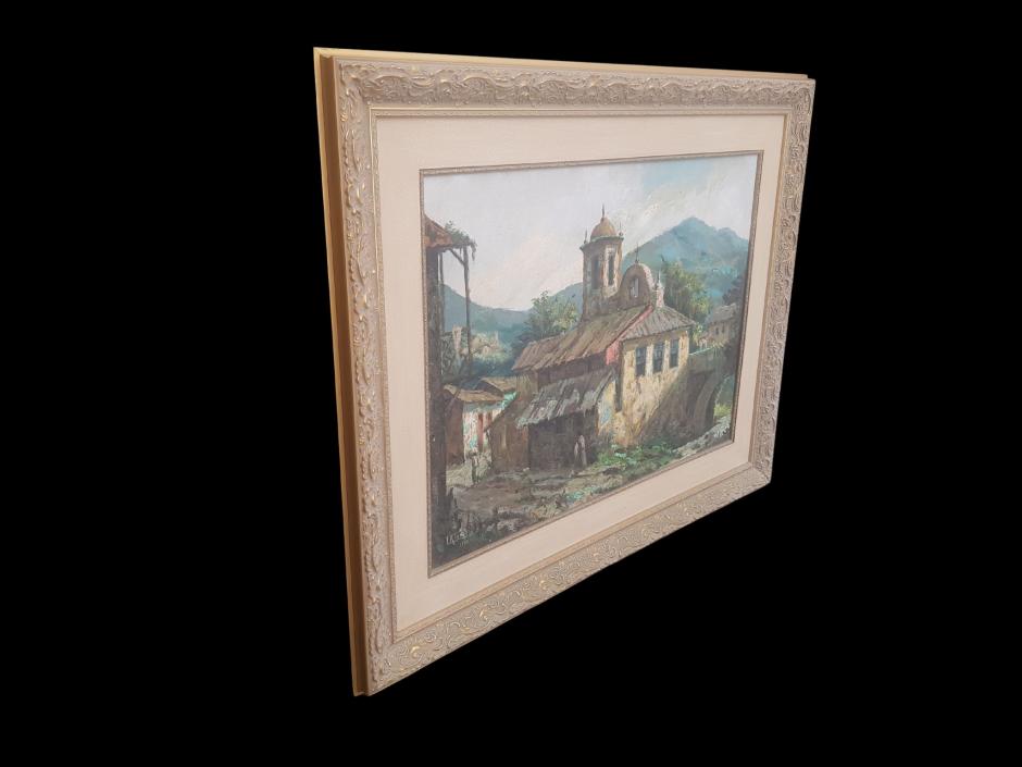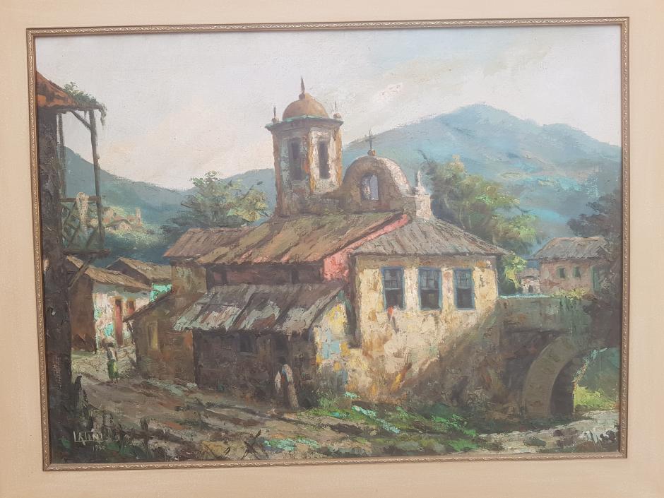 Belíssimo quadro em óleo sobre tela pintado pelo artista plástico Anélio Latini Filho (1926–1986), representado paisagem de um vilarejo com uma igreja e casas antigas. Assinado no canto inferior esquerdo e datado de 1970. Moldura em madeira dourada adornada com arabescos em relevo.