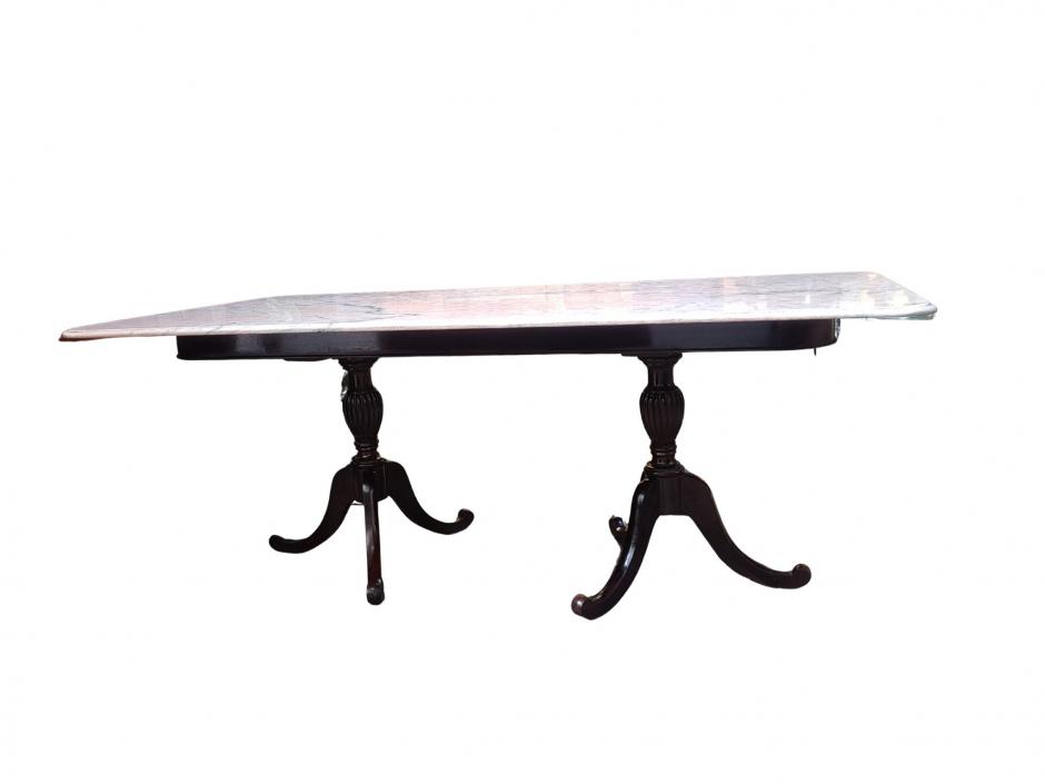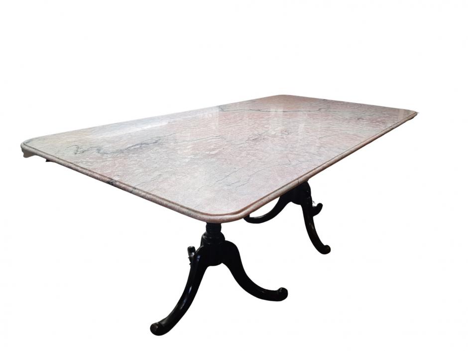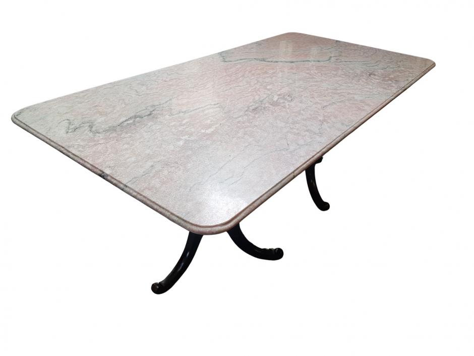 Elegante mesa de jantar em madeira nobre, tampo retangular em mármore na tonalidade rosa, apoiado sobre duas bases torneadas em balaústre com terminações tripoides.