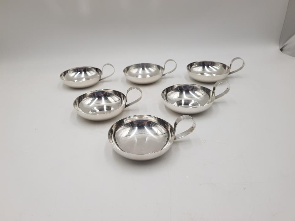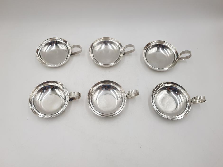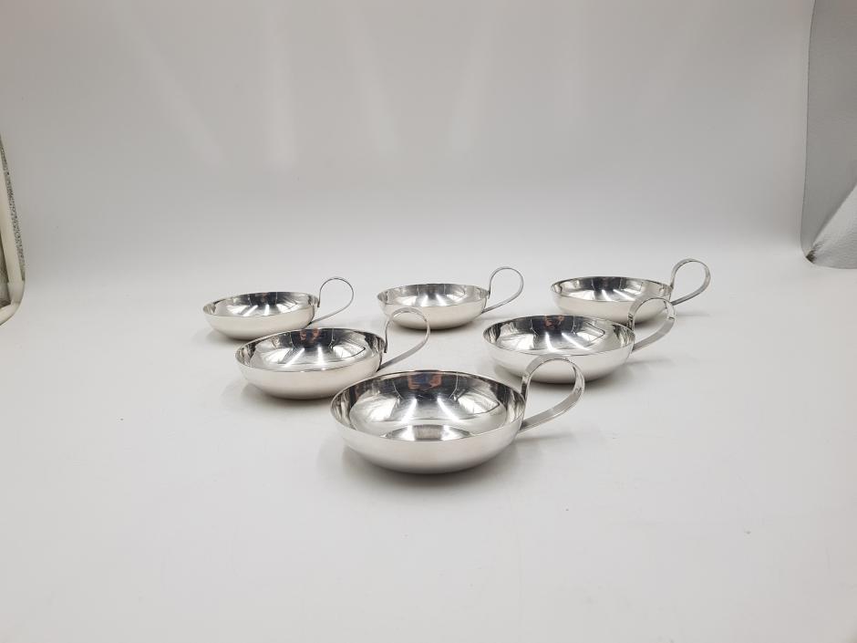 Conjunto com 06 taças para sorvete em metal espessurado à prata da marca Wolff.