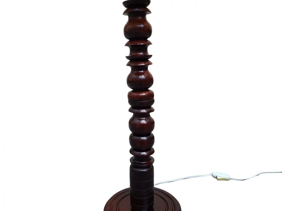 Abajur em madeira nobre, haste em coluna torneada e base redonda. Cúpula cônica decorada com folhagens. Altura: 95cm
