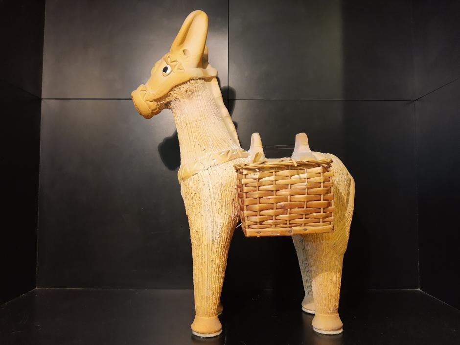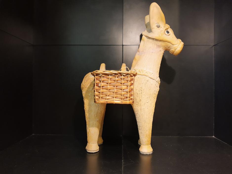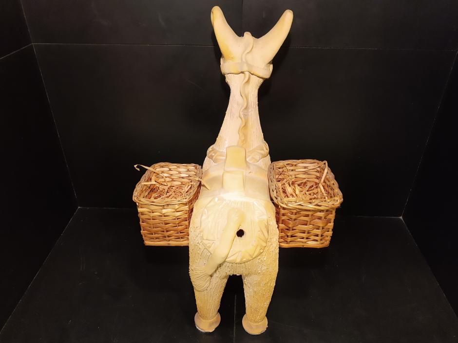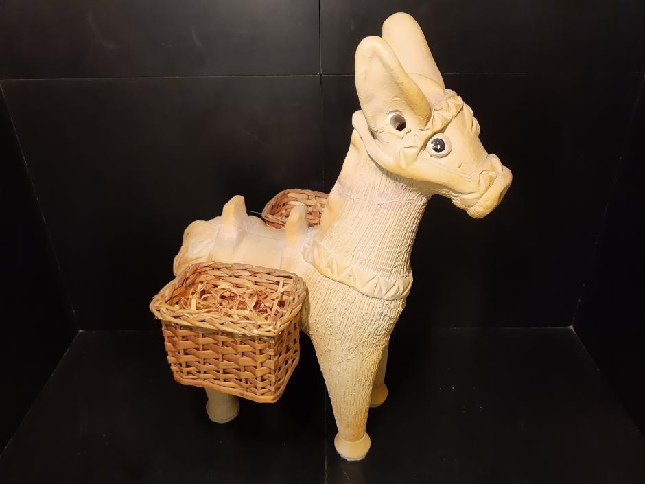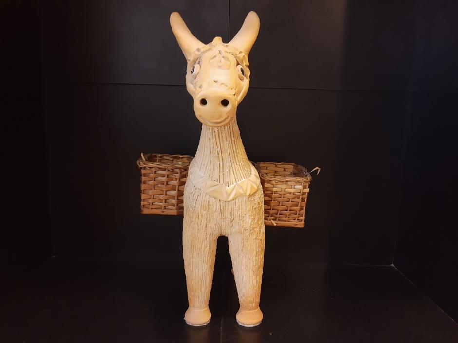 ARTE POPULAR – Escultura em terracota representando figura de um burro, com 02 cestos para flores. Altura: 50cm