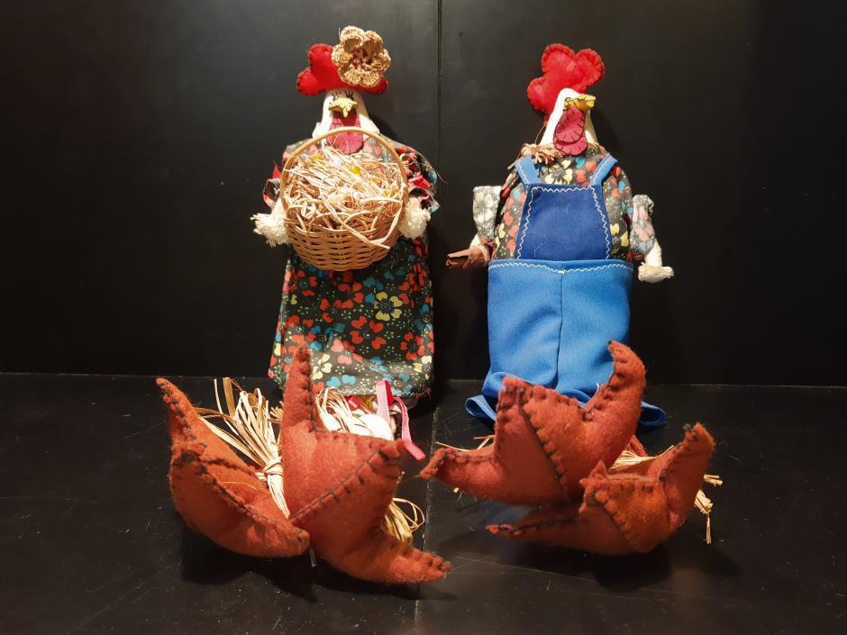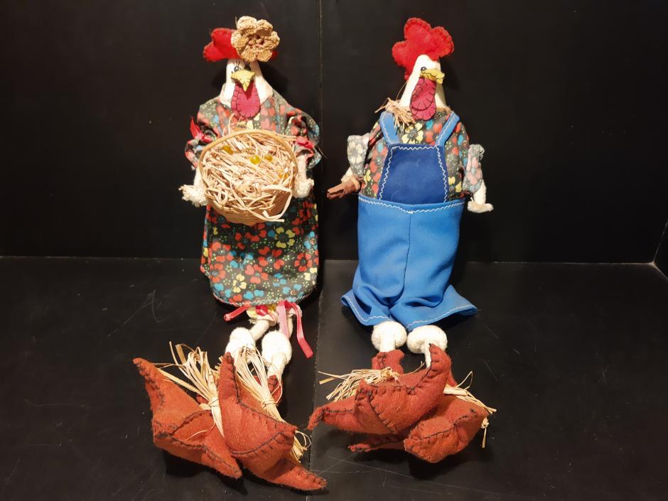 Casal galo e galinha em tecido, com estampa floral. Altura: 47cm