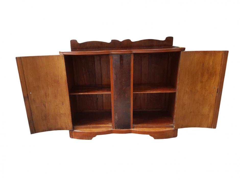 Antigo móvel buffet em madeira de lei no estilo Art Déco, com 02 portas abauladas e 01 prateleira interna, decorado com detalhe superior em madeira recortada, finalizado com puxadores em madeira trabalhada.