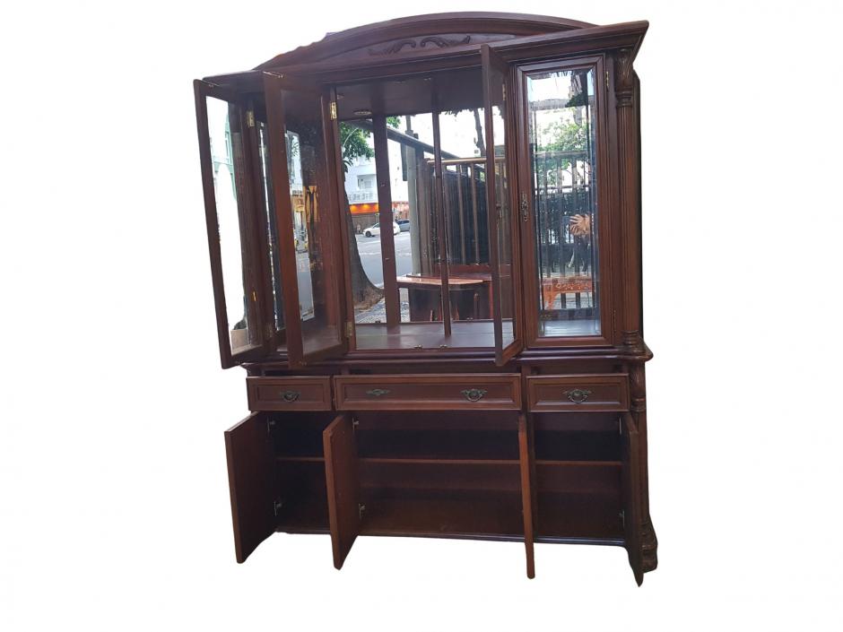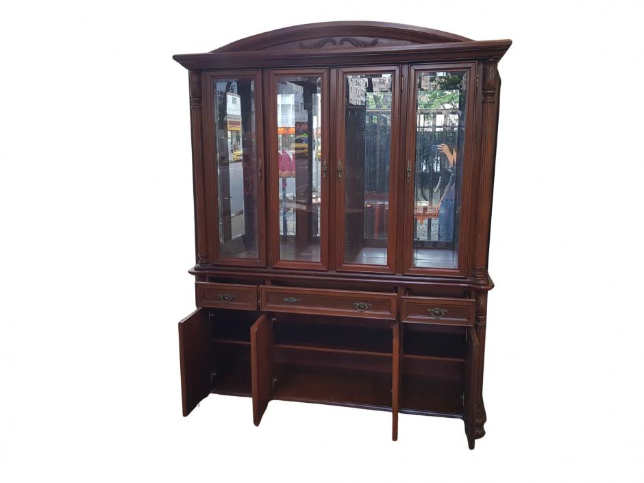 Majestosa cristaleira em madeira nobre decorada com trabalhos de entalhes, na parte inferior conta com 04 portas com 01 prateleira interna e 03 gavetas, na parte superior possui 04 portas com vidro bisotado e 02 prateleiras em vidro. Finalizada com fundo espelhado, iluminação interna e puxadores em metal trabalhado.
