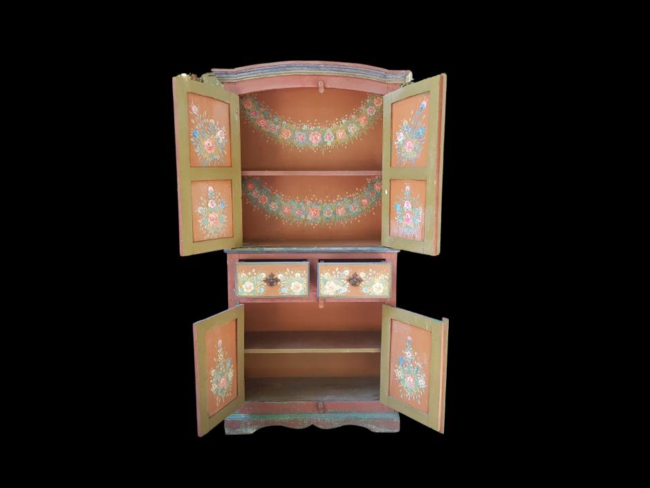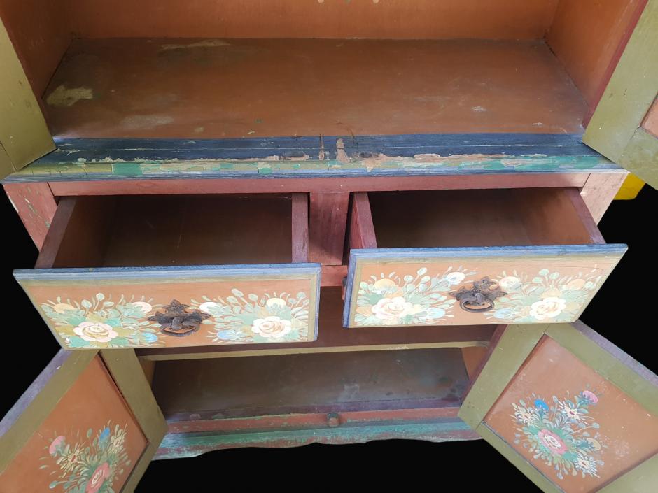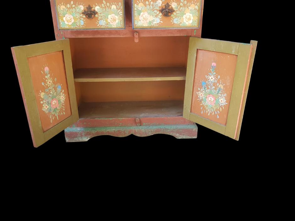 Antigo móvel de fazenda, colonial brasileiro em madeira de demolição, tonalidade bordô com rosas e flores pintadas à mão em seu exterior e interior, finalizado com puxadores em ferro trabalhado. O móvel conta com 02 gavetas, 04 portas, sendo: 02 na parte superior e 02 na parte inferior, ambas com 01 prateleira interna.