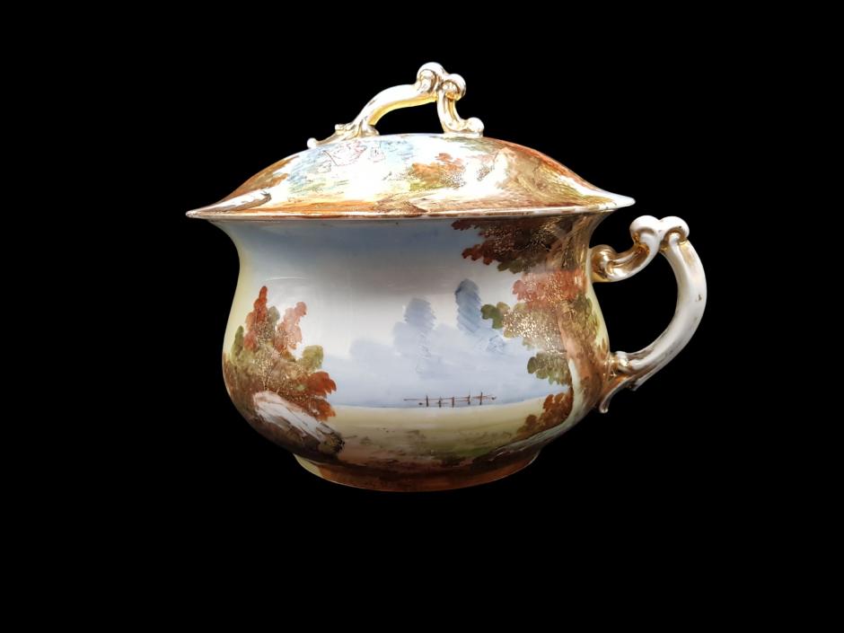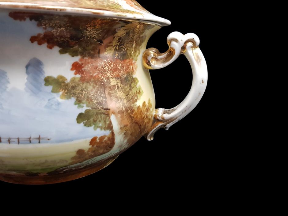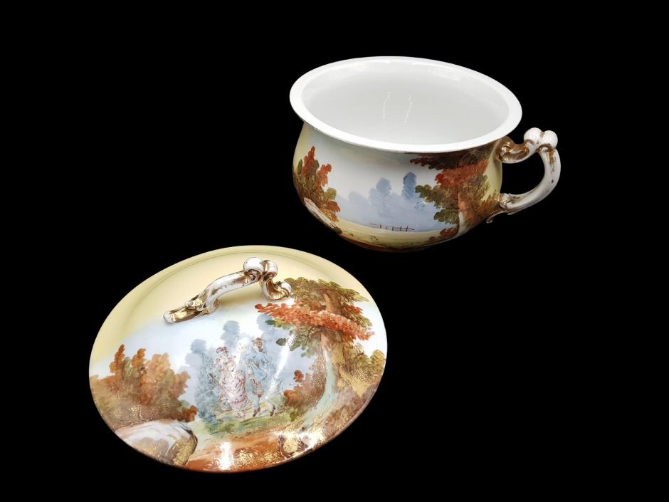 Raro penico em porcelana francesa da marca B. R&L - Limoges, ricamente pintado à mão, ornado com nobres personagens em roupas de época e paisagens campestre, finalizado com alças trabalhadas e filetadas a ouro.