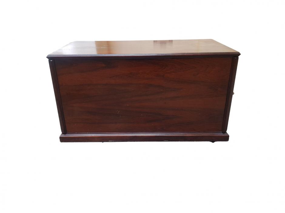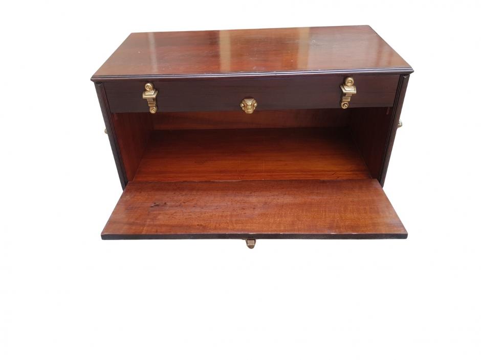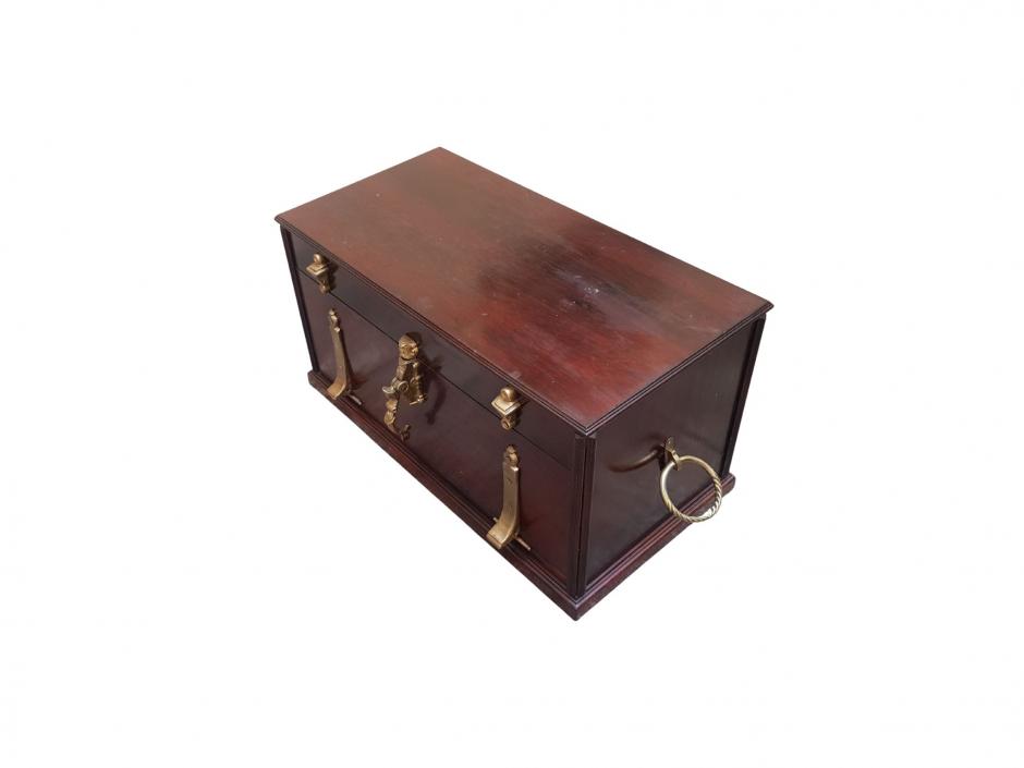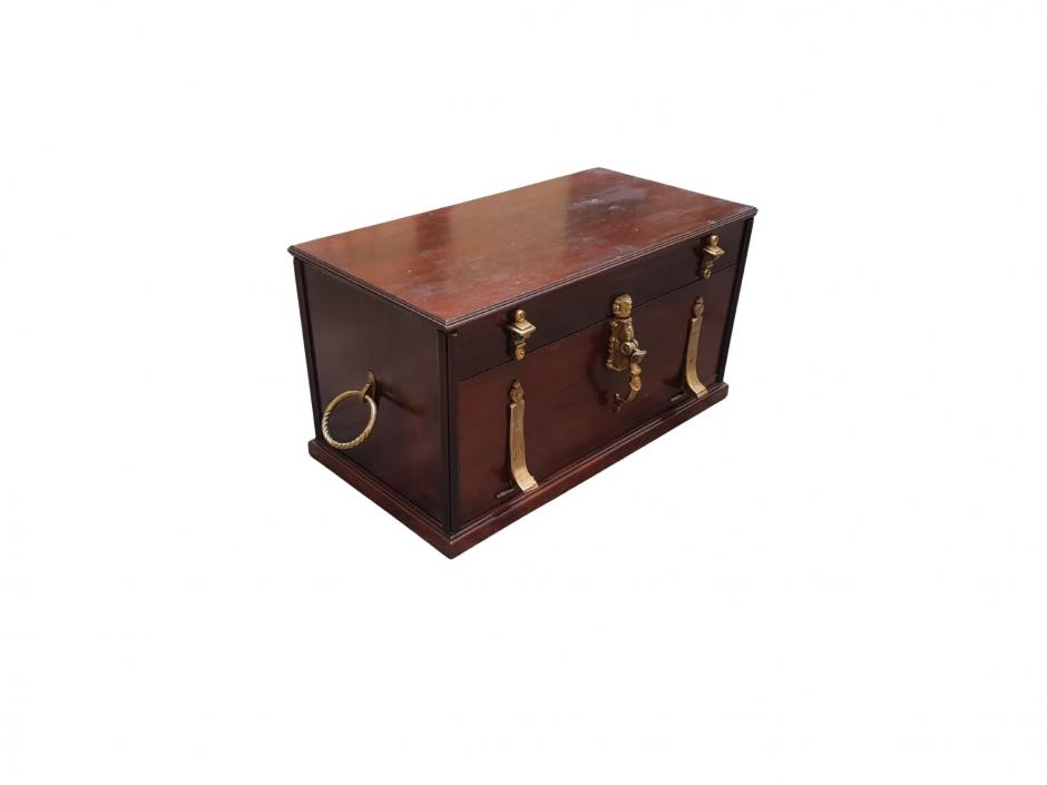 Majestoso baú com formato retangular em madeira de lei. Conta com 02 alças laterais e guarnições em bronze trabalhado e uma porta frontal, finalizado com fechadura no feitio de figura mitológica.