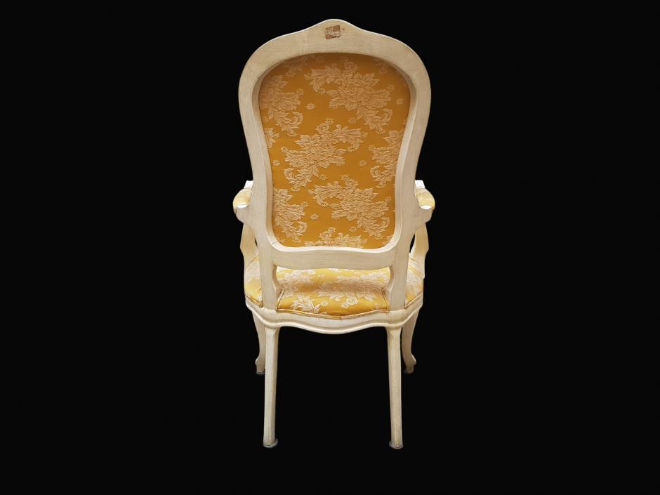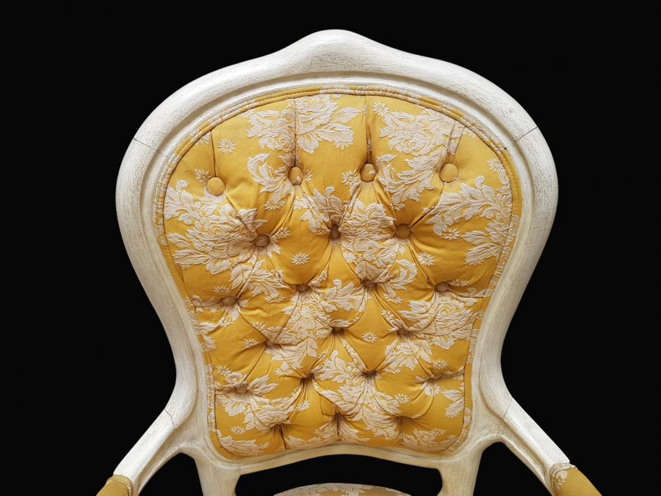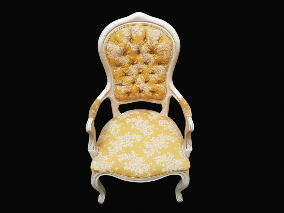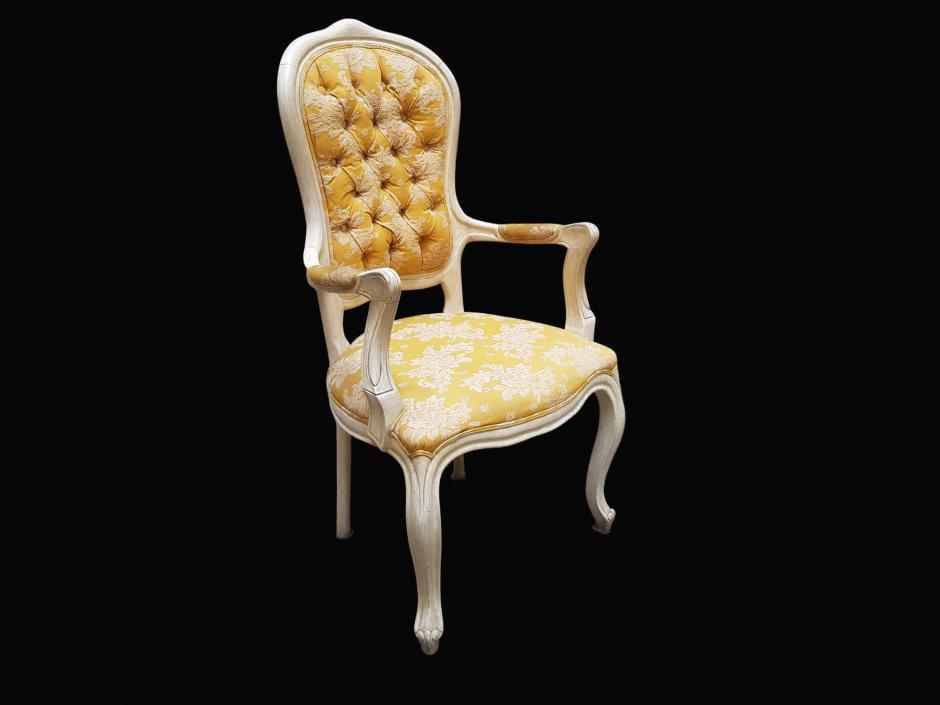 Elegante cadeira de braço estilo Luís XV, em madeira nobre com patina na cor marfim, estofada com tecido brocado na cor mostarda, finalizada com espaldar em capitonê.