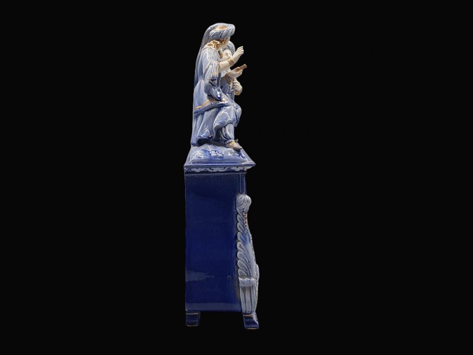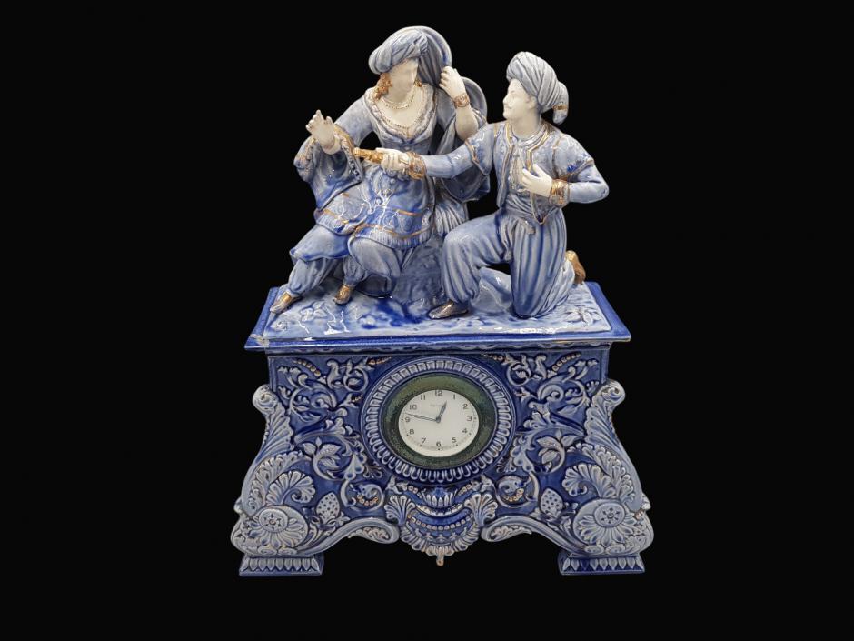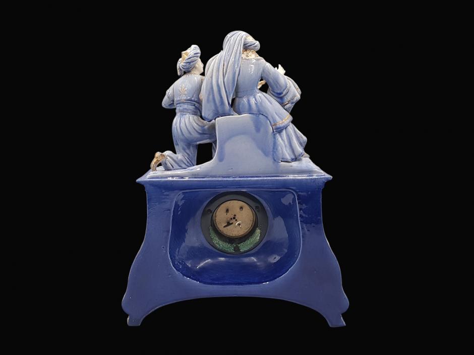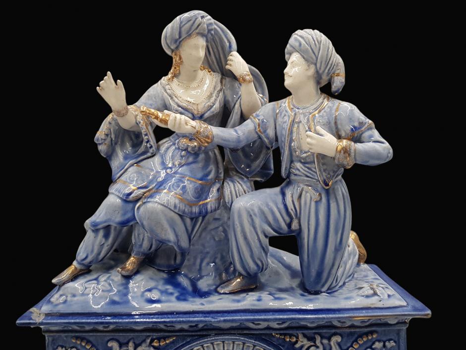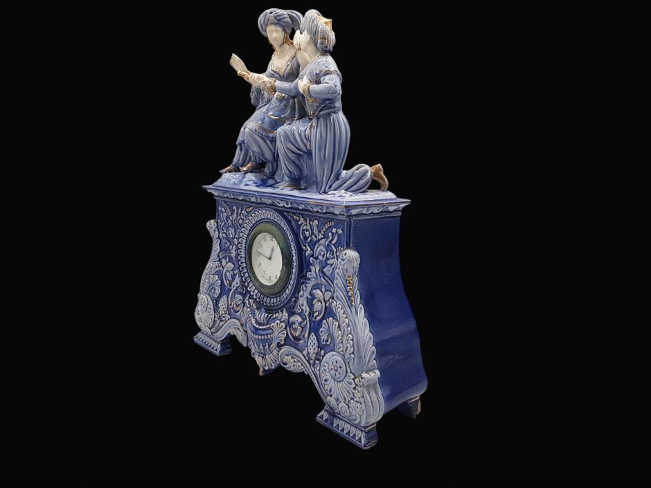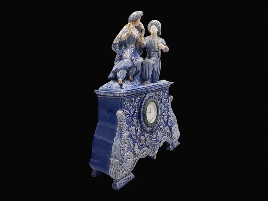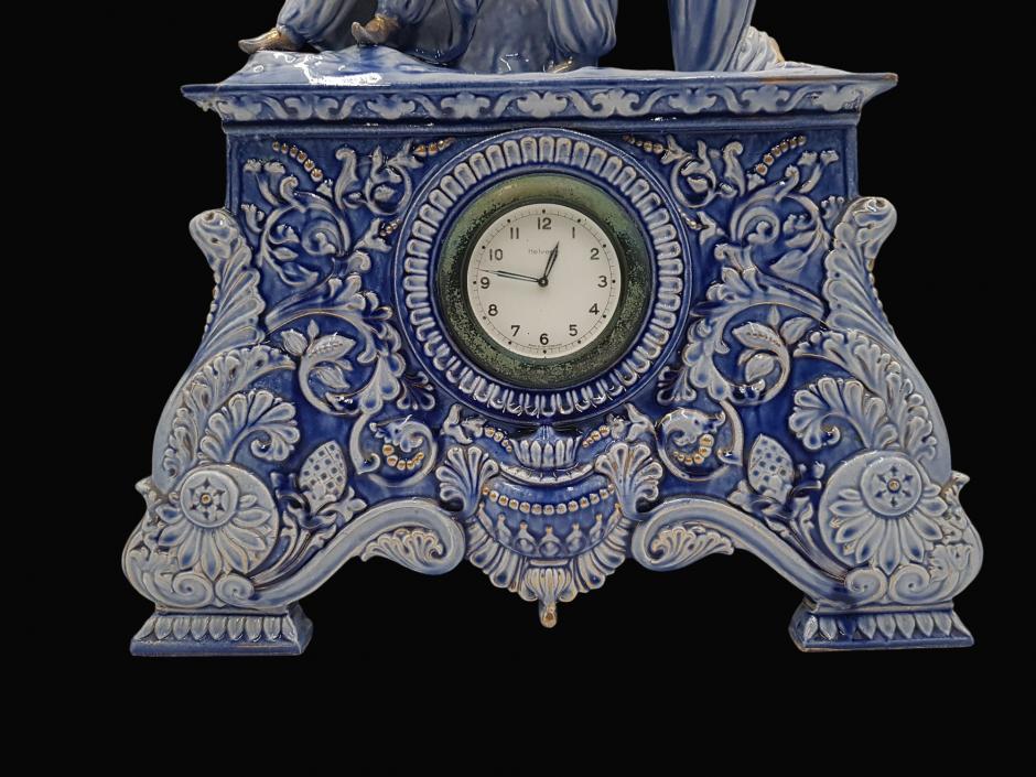 Antigo relógio de mesa suíço da HELVECO, caixa em faiança na tonalidade azul ricamente ornada com motivos florais em relevo e acabamentos em dourado, finalizado com escultura representando casal de fidalgos em cena galante na parte superior.